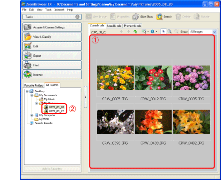 下載的影像會按照拍攝日期儲存在資料夾裡,並顯示在「ZoomBrowser EX」的主視窗中。