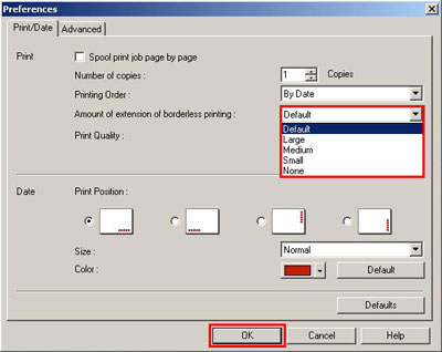 4-2. 從「列印/日期(Print/Date)」選項卡的「滿版列印擴展量(Amount of extension of borderless printing)」下拉功能表中,選擇需要的擴展量。