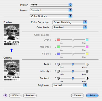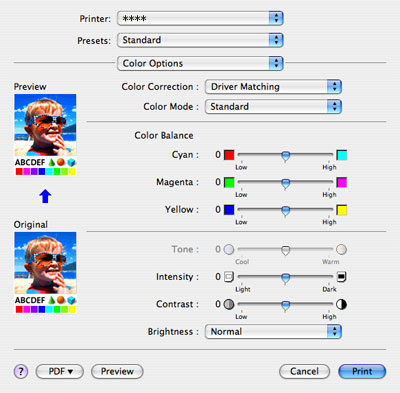 要使列印結果的色彩接近於所想的色彩,更改「色彩校正(Color Correction)」、「輸入設定檔(Input Profile)」、「色彩模式(Color Mode)」、「色彩平衡(Color Balance)」、「色調(Tone)」(僅對於單色列印)、「強度(Intensity)」「對比度(Contrast)」及「亮度(Brightness)」的設定。