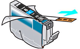 6. 拆開墨水盒包裝,按箭頭所示方向取下橙色膠帶,然後撕下薄膠片帶。