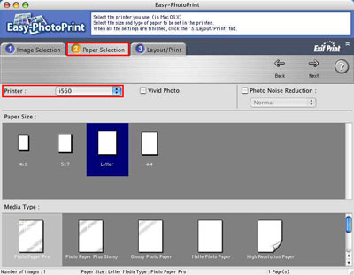 2. 選擇「紙張選擇(Paper Selection)」選項頁以顯示「紙張選擇(Paper Selection)」頁,然後從彈出的「印表機(Printers)」功能表中選擇使用的印表機名稱。