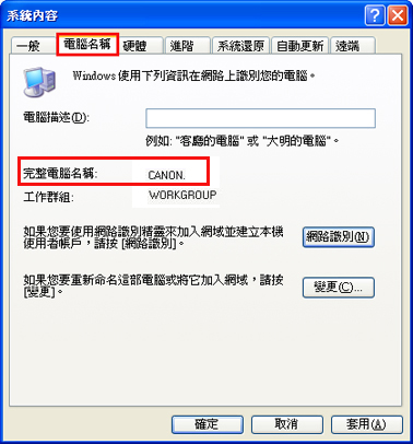 - 作為一個示例,此處電腦名稱為 Canon 。