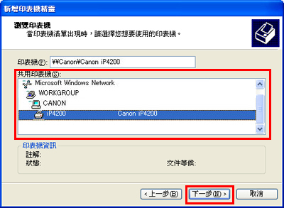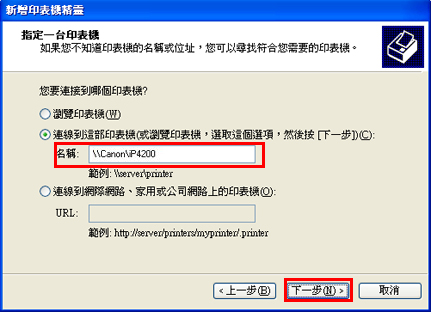 - 此處輸入 \\Canon\iP4200 作為示例。