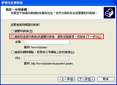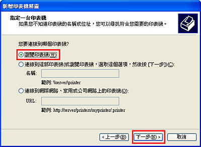 b.透過「連線到這部印表機(或瀏覽印表機,選取這個選項,然後按一下[下一步])」指定印表機