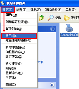 4) 選擇 Canon iP4200, 然後從「檔案」功能表中選擇「共用」。