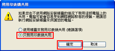 6) 選擇「只啟用印表機共用」,然後按一下[確定]。