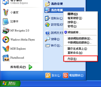 1) 右健按一下「我的電腦」,然後按一下「內容」。
