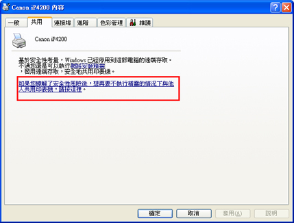 5) 按一下「如果您瞭解了安全性風險後,想再要不執行精靈的情況下與他人共用印表機,請按這裡。」