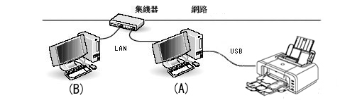 下文中,透過 USB 電纜線與共用印表機相連的電腦(A)簡稱為「列印伺服器」,新增的電腦(B)簡稱為「客戶機」。
