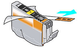 6. 拆開墨水盒包裝,按箭頭所示方向取下橙色膠帶,然後撕下薄膠片帶。