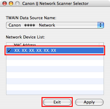 22. 在「Canon IJ 網路掃描器選擇器(Canon IJ Network Scanner Selector)」螢幕上,確認在「網路設備清單(Network Device List)」中本機的 MAC 位址上顯示了核取標記,然後按一下[退出(Exit)]關閉對話方塊。
