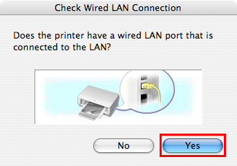 15. 顯示「檢查 LAN 連接(Check Wired LAN Connection)」對話方塊時,使用 LAN 電纜線將印表機連接至集線器等網路設備,然後按一下[是(Yes)]。