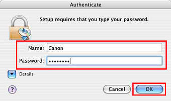 6. 輸入用於認證的「名稱(Name)」和「密碼(Password)」,然後按一下[確定(OK)]。
