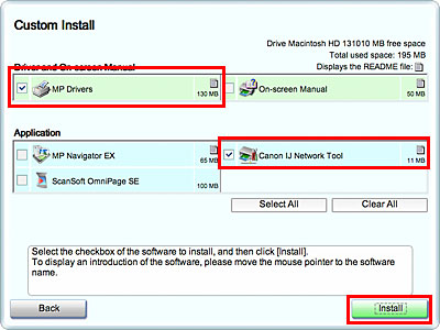 a. 顯示以下視窗時,選擇「MP 驅動程式(MP Drivers)」、「Canon IJ 網路工具(Canon IJ Network Tool)」及需要的其他應用程式軟體,然後按一下[安裝(Install)]。