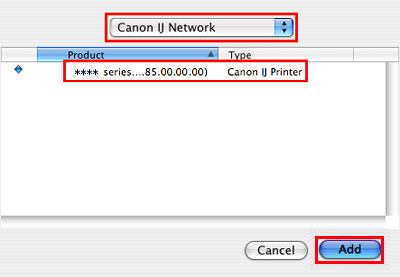 20. 從彈出的功能表中選擇「CANON IJ 網路(CANON IJ Network)」,在產品欄中選擇正在使用的印表機,然後按一下[新增(Add)]。
