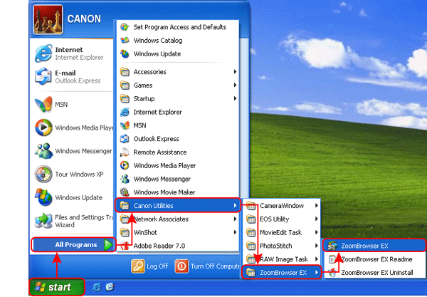 如果桌面上沒有「ZoomBrowser EX」捷徑圖示,請按一下「開始(Start)」選單,然後依次序選擇「所有程式(All Programs)」或「程式(Programs)」、「Canon Utilities」、「ZoomBrowser EX」及「ZoomBrowser EX」以啟動該程式。