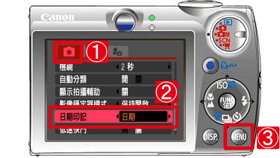 只有設定[記錄像素數]為[明信片]時,才能設定[日期印記]。如果設定[記錄像素數]為其他設定(大、中 1、中 2、中 3、小、闊螢幕),則不能設定[日期印記]。要使用除[明信片]以外的其他設定插入日期,請參閱以下資訊︰設定日期或邊框後從相機直駁打印。