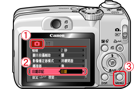 只有設定[記錄像素數]為[明信片]時,才能設定[日期印記]。如果設定[記錄像素數]為其他設定(大、中 1、中 2、中 3、小、闊螢幕),則無法設定[日期印記]。要使用除[明信片]以外的其他設定插入日期,請參閱以下資訊︰設定日期或邊框後從相機直駁打印。