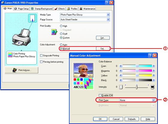如果已設定使用打印機驅動程式功能調整影像色彩,請關閉該功能(見下圖)。如果啟用打印機驅動程式功能,則步驟 II 中的打印機色彩描述檔設定不會應用到打印結果中。