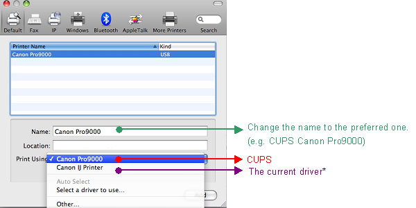 要從步驟 5 的應用程式中識別各驅動程式,應將印表機名稱變更為喜好的名稱。 (例如,CUPS Canon Pro9000)