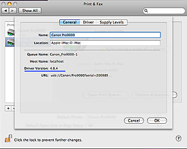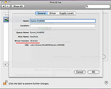 - 在「系統喜好設定 (System Preferences)」中選擇「列印和傳真 (Print & Fax)」,然後按一下「選項與耗材 (Options & Supplies)」。 將顯示當前指定的驅動程式版本。