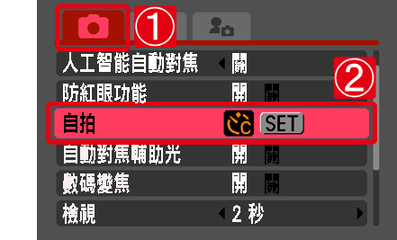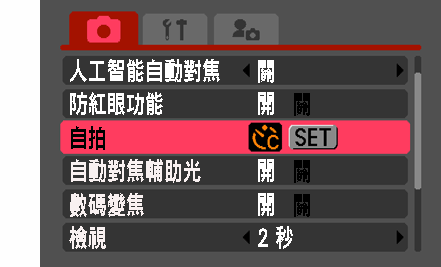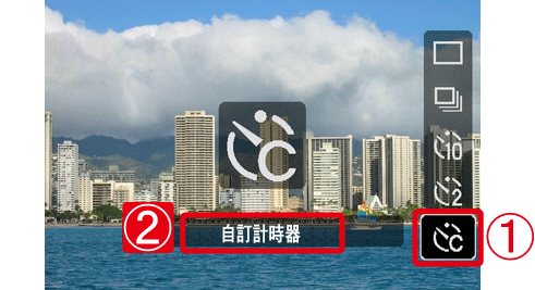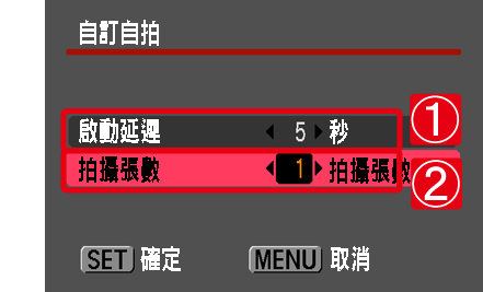 您可以使用[自拍]選單的[自訂自拍]來隨意設定延遲時間及拍攝張數。