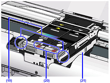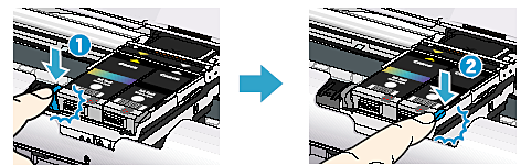 - 如果在安裝列印頭后提起列印頭鎖定桿,請按照圖示從左至右按下兩邊的卡子直至全部鎖定到位。