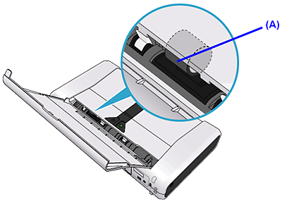 如果問題沒有解決,關閉印表機,拔下電源插頭,用濕棉花籤或類似的東西擦拭后端托盤內右側的送紙滾軸(A)。 清潔時手動旋轉滾軸(A)。 請勿用手指觸摸滾軸;用棉花籤旋轉。 如果這不能解決問題,請聯繫佳能服務中心。