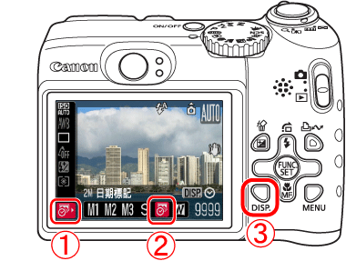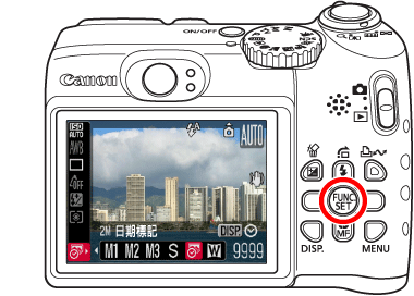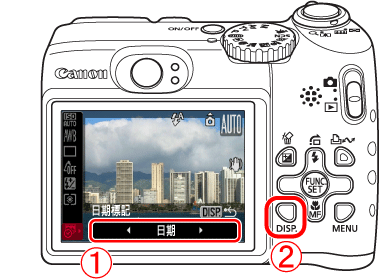如下所示,請按相機的(左及右)按鈕,選擇[日期標記]並設定為[日期]或[日期與時間]。