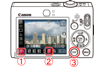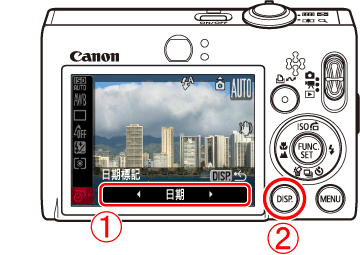 如下所示,請按相機的(左及右)按鈕,選擇[日期標記]並設定為[日期]或[日期與時間]。