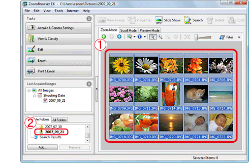 下載影像會儲存在按拍攝日期創建的資料夾裡,並出現在 ZoomBrowser EX 的瀏覽視窗中。
