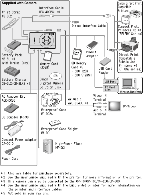 - 請使用此連接線將相機連接到電腦、小型照片打印機(SELPHY 系列)或噴墨打印機*。