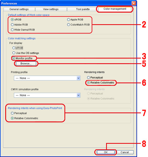 7.如果在佳能打印機上使用 Easy-PhotoPrint,請在 [使用 Easy-PhotoPrint 時的色彩對應方式 (Rendering intents when using Easy-PhotoPrint)] 中選擇 [相對色彩濃度 (Relative Colorimetric)]。