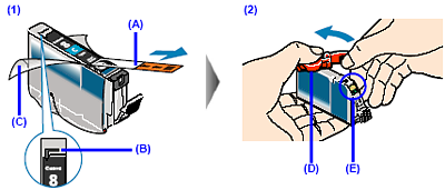 (1) 從包裝中取出新墨水盒,然後按箭頭方向 (A) 撕下橙色膠帶以使氣孔 (B) 上沒有殘留保護薄膜。然後完全撕下保護薄膜 (C)。