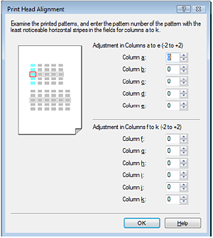 (1) 查看列印的圖案並在欄 a 區域內選擇水平條紋最不明顯的圖案數值。