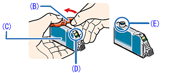 2. 擰斷並丟棄位於墨水盒底部的橙色保護蓋 (B)。