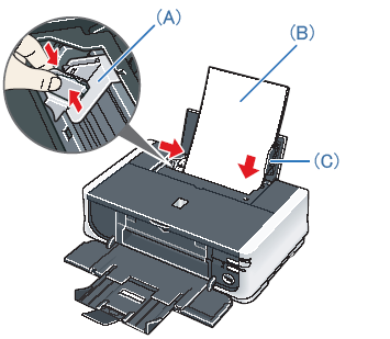 1. 捏住導紙器 (A) 將其滑向左端。在後端托盤中裝入兩張隨附紙張 (MP-101),列印面 (較白的一面) (B) 朝上,與托紙架導紙器 (C) 右側對齊,然後將導紙器滑向紙疊。