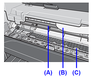 - 請勿觸摸透明薄膜 (A)、薄膜電纜線 (B)、廢墨收集器 (海綿部分) (C) 或任何金屬部件。
