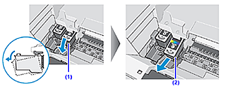 - 用新墨盒更換空墨盒。 如果插入取出過的 FINE 墨盒,由於某些原因如噴嘴堵塞,本機可能無法正常列印輸出。此外,使用此類墨盒,低墨水量警告可能無法正常出現。