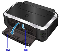 1. 啟出紙托盤 (A) ,然後開啟及內蓋 (B)。
