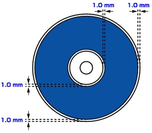 可列印的 DVD 及 CD 的列印區域為標籤的內直徑與外直徑 1 mm以外的區域。