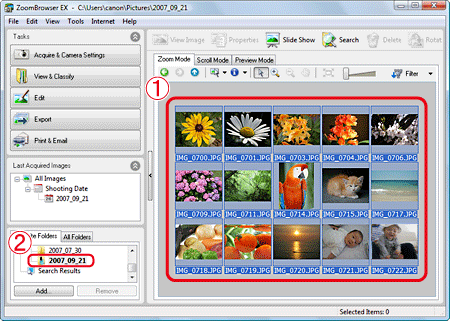 下載影像會儲存在按拍攝日期創建的資料夾裡,並出現在 [ZoomBrowser EX] 的瀏覽視窗中。