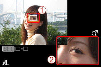 按相機的上、下、左及右按鈕移動橙色框。對於人物拍攝,建議在離相機最近的地方查看焦點,如主體的眼鏡或鼻子,或其他有明顯輪廓的地方。