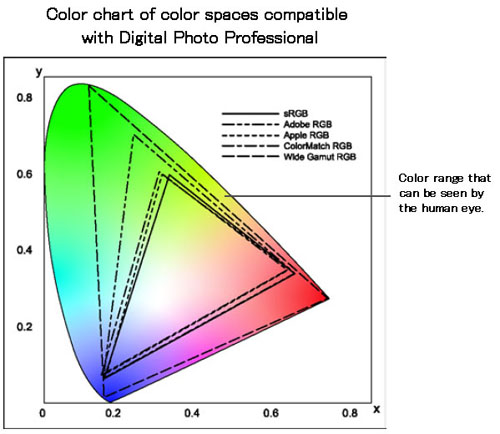 色域是重現的色彩範圍。數碼相機可以使用廣泛使用的 sRGB 色域及生動展現綠色及藍色範圍的 Adobe RGB 色域。「Digital Photo Professional」支援五種色域,您可以根據需要設定可以展示影像最佳特性的色域。