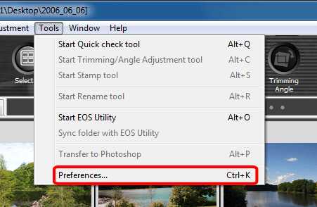 1. 啟動「Digital Photo Professional」,選擇[工具(Tool)]選單中的[喜好設定(Preferences)]。