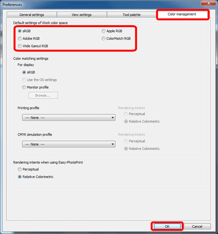 選擇[色彩管理(Color management)]設定頁以選擇您需要的色域,然後按一下[確定(OK)]。
