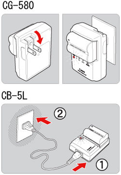如箭頭所示,打開電池充電器插頭並將插頭插入電源插座。