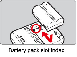 - 將電池的前邊緣與充電器的標刻線對齊。 按下電池時,按箭頭方向滑入。