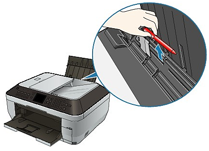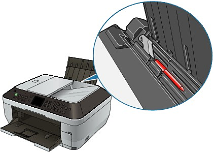 - 在後端托盤中裝入紙張時,列印面向上裝入紙張並將導紙器與紙張的兩側對齊。