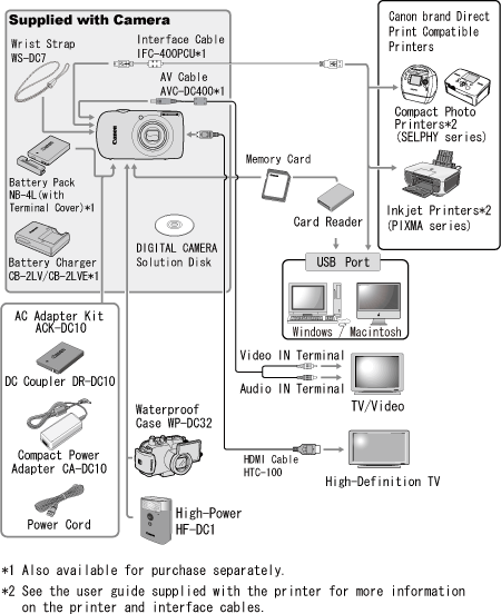 - 建議使用佳能原裝配件。使用佳能原裝配件時,該產品可達到最佳性能。佳能對非原裝佳能配件的故障 (如電池洩漏與/或電池爆炸) 而導致本產品的損壞與/或意外,如火災等,不承擔任何責任。請注意,此保證不適用於非原裝佳能配件的故障,但是您可以請求付費維修。